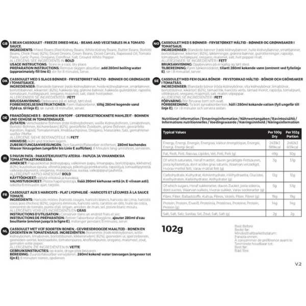 Die Nährstoffdichte dieses Gerichts basiert auf einer präzisen Auswahl hochwertiger Hülsenfrüchte. Die Basis bildet ein beeindruckender Bohnenmix (62 %), bestehend aus roten Kidneybohnen, weißen Kidneybohnen, Limabohnen, Borlottibohnen und Kichererbsen. Diese Vielfalt sorgt für ein vollständiges Aminosäurenprofil und langanhaltende Sättigung. Ergänzt wird die Mischung durch grüne Bohnen, gewürfelte Zwiebeln und Karotten, die in einer aromatischen Sauce aus Tomatenmark und Knoblauchpüree gegart wurden. Die technische Finesse liegt in der Würzung: Oregano und gemahlener weißer Pfeffer verleihen dem Gericht eine tiefgehende Note, die Deine Sinne belebt. Mit 601 Kcal pro Portion liefert diese Gefriergetrocknete Mahlzeit ein optimales Verhältnis von 50g Fett, 12g Kohlenhydraten und 14g Protein pro 100g Trockengewicht, was Deinen Stoffwechsel stabilisiert und Heißhungerattacken verhindert.