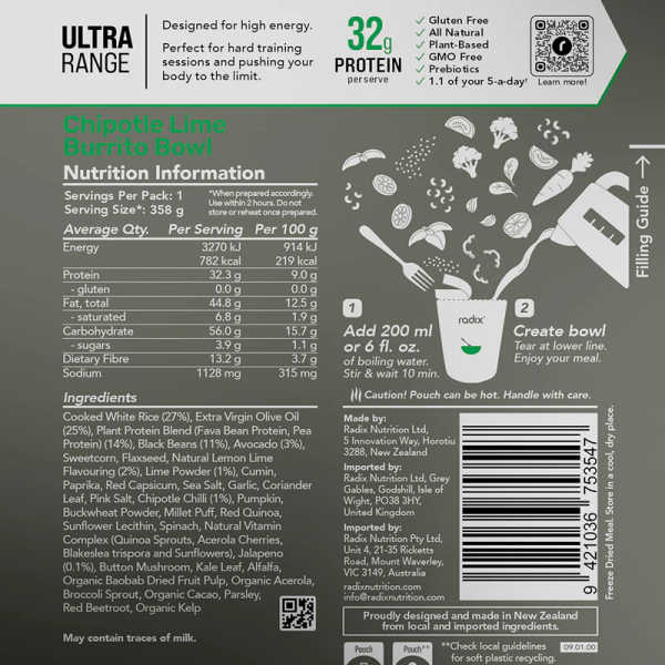Zusammenfassend lässt sich sagen, dass die Chipotle Lime Burrito Bowl von Radix Nutrition die Messlatte für moderne Outdoor-Verpflegung neu definiert. Du investierst hier nicht nur in Kalorien, sondern in eine technologische Lösung für Deine physische Belastbarkeit. Mit der Ultra Range erhältst Du eine Leichtgewicht-Nahrung, die unter strengsten Qualitätskriterien in Neuseeland gefertigt wird und Profis weltweit durch ihre extreme Nährstoffdichte überzeugt. Die lange Haltbarkeit und die kompromisslose Auswahl natürlicher Superfoods machen sie zur ersten Wahl für jeden, der seine Leistungsgrenzen verschieben will. Wer sagt, dass Expeditionsnahrung nur Mittel zum Zweck sein muss? Erlebe die Synergie aus hochwertigem Reis, Olivenöl und einem Vitaminkomplex, der Deinen Körper von innen heraus stärkt. Pack Dir die Chipotle Lime Burrito Bowl in Deinen Rucksack und spüre den Unterschied, wenn wissenschaftliche Präzision auf echten Geschmack trifft. Dein nächstes Abenteuer wartet!