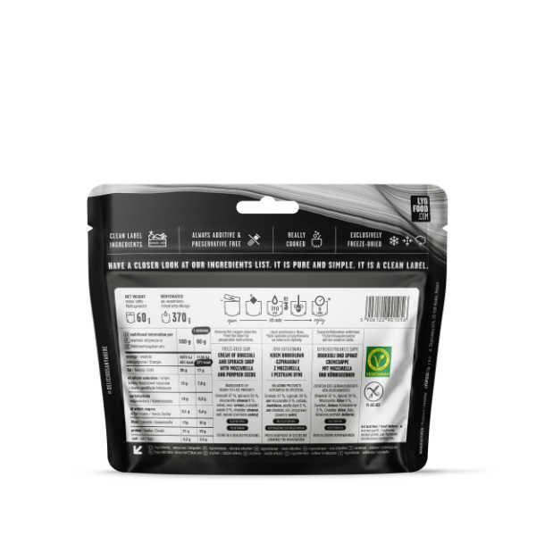 Die Qualität der Zutaten ist das Fundament der LYOFOOD-Philosophie und bei dieser Suppe besonders beeindruckend. Mit einem massiven Anteil von 37 % Brokkoli und 33 % Spinat erhalten Sie eine konzentrierte Ladung an Chlorophyll, Eisen und Vitaminen. Ein technisches Highlight der Rezeptur ist die Fett- und Proteinquelle: 9 % echter Mozzarella Käse und eine Prise würziger Cheddar sorgen zusammen mit frischer Sahne für eine unvergleichlich cremige Konsistenz und liefern die notwendigen Lipide für die Wärmeproduktion des Körpers. Ein weiterer strategischer Inhaltsstoff sind die 5 % Kürbiskerne, die nicht nur für einen angenehmen Biss sorgen, sondern auch wertvolles Zink und Magnesium für die Muskelregeneration im Outdoor-Alltag liefern. Da LYOFOOD konsequent auf künstliche Zusätze, Farbstoffe und Konservierungsmittel verzichtet, genießen Sie eine gesunde Mahlzeit, die Ihren Körper nicht mit Chemie belastet, sondern ihn aktiv durch natürliche Ressourcen stärkt.