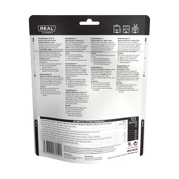 Die Crunchy Granola von Real Turmat ist eine gefriergetrocknete Mahlzeit, sauber verpackt in einem praktischen, wiederverschließbaren Beutel. Dies macht es nicht nur kinderleicht, sie auf Ihren Abenteuern mitzunehmen, sondern sie ist auch super einfach zuzubereiten. Fügen Sie einfach Wasser hinzu – kalt oder warm, ganz nach Ihrem Geschmack – und in wenigen Minuten haben Sie eine reichhaltige Mahlzeit voller Ballaststoffe, Proteine und Kohlenhydrate.