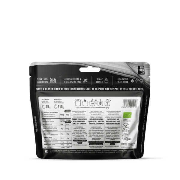 Die Qualität der Zutaten ist das Herzstück der LYOFOOD-Philosophie. Mit einem Anteil von 53 % bilden glutenfreie Haferflocken die solide Basis aus komplexen Kohlenhydraten, die Ihren Blutzuckerspiegel stabil halten und Heißhungerattacken vorbeugen. Ergänzt werden diese durch 37 % cremige Kokosmilch, die wertvolle mittelkettige Triglyzeride (MCT-Fette) liefert – eine Energieform, die der Körper besonders schnell in Wärme und Leistung umwandeln kann. Die Süße stammt ausschließlich aus hochwertigem Agavendicksaft, während 2 % Apfelwürfel und 1 % Preiselbeeren für natürliche Vitamine und eine feine Säure sorgen. Ein technisches Highlight sind die enthaltenen Chiasamen, die für zusätzliche Omega-3-Fettsäuren und eine langanhaltende Sättigung sorgen. Der Zimtanteil von 0,3 % ist nicht nur geschmacksgebend, sondern wirkt auch stoffwechselanregend. Da alle Zutaten aus ökologischem Landbau stammen, ist dieses Frühstück eine gesunde Wahl, die frei von künstlichen Aromen, Farbstoffen oder Konservierungsmitteln ist.