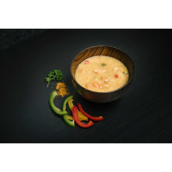 Die Real Turmat-Hühnersuppe besteht zu 17 % aus Hühnchen, wird mit Salz und Pfeffer gewürzt und mit nahrhaften Zutaten wie Kokosmilch, Weizenmehl, Paprika, Zwiebeln und Lauch angereichert. Die dezenten Noten von Sojasauce und Limettensaft ergeben zusammen mit der Wärme des Ingwers und der Kraft des Knoblauchs ein komplexes und dennoch harmonisches Geschmacksprofil. Ein Hauch Petersilie und der Zusatz eines Antioxidans, Ascorbinsäure, runden die Zutatenliste ab und sorgen für ein reichhaltiges, sättigendes Geschmackserlebnis.