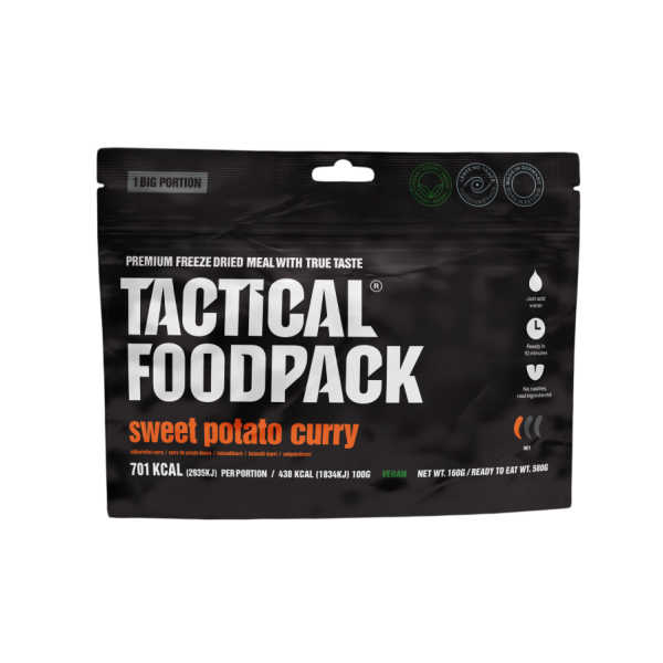 Wenn Sie draußen in der Wildnis an Ihre Grenzen gehen oder sich auf ernsthafte Calamitäten vorbereiten, ist eine ausreichende Energiezufuhr der entscheidende Faktor. Das Süßkartoffel-Curry von Tactical Foodpack in der Big Pack Version wurde speziell für Abenteurer mit hohem Kalorienbedarf entwickelt. Mit beeindruckenden 701 kcal pro Portion bietet dieses Gericht nicht nur eine Explosion exotischer Aromen, sondern auch die notwendige Energie, um Ihren Körper und Geist wieder vollständig aufzuladen. Die sanfte Süße der Süßkartoffel bildet das Herzstück, eingebettet in eine würzige Mischung aus Kokosmilch, Curry und proteinreichen Kichererbsen. Ob nach dem Bezwingen eines Gipfels oder einem harten Tag im Notquartier – diese royale Mahlzeit ist die kulinarische Belohnung, die Sie durchhalten lässt.