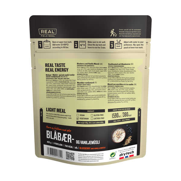 Bereiten Sie Ihr Frühstück im Handumdrehen mit dem Blaubeeren-Vanille-Müsli von Real Field Meal zu. Den oberen Teil des Beutels aufreißen, den Boden auffalten, Wasser hinzufügen und umrühren. Verschließen Sie den Beutel und warten Sie 8–10 Minuten, dann ist Ihr köstliches Frühstück fertig zum Verzehr. Sie können diese Mahlzeit entweder mit heißem oder kaltem Wasser zubereiten und sind somit perfekt für jede Situation.